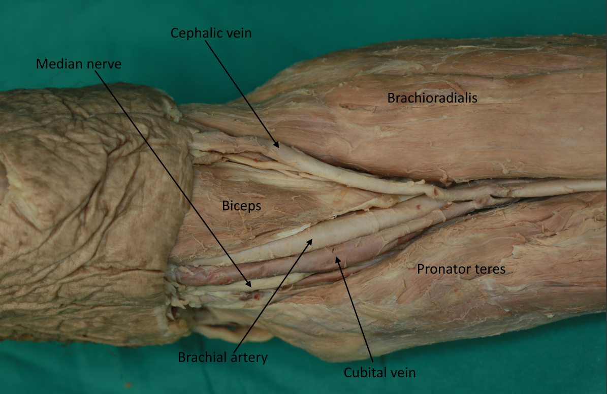 Which structure separates the cephalic vein and the brachial artery in the antecubital fossa?