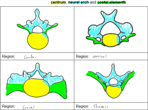 b) Outline and colour the parts derived from the centrum, neural arch and costal elements.