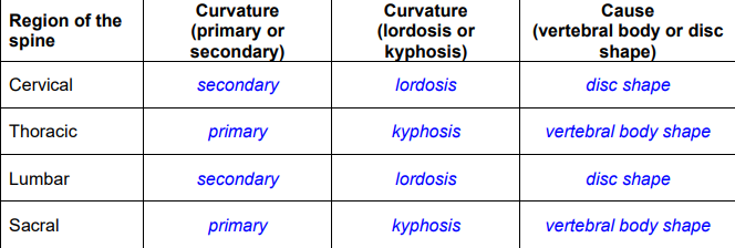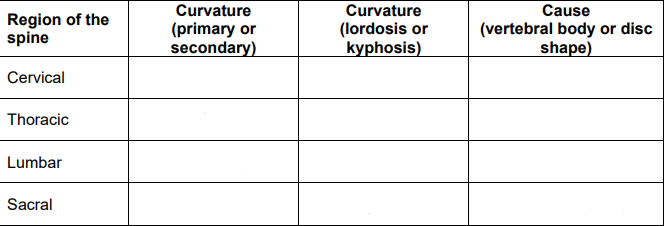 complete the table below indicating where bone shape or disc shape primarily causes the curvature in each region: