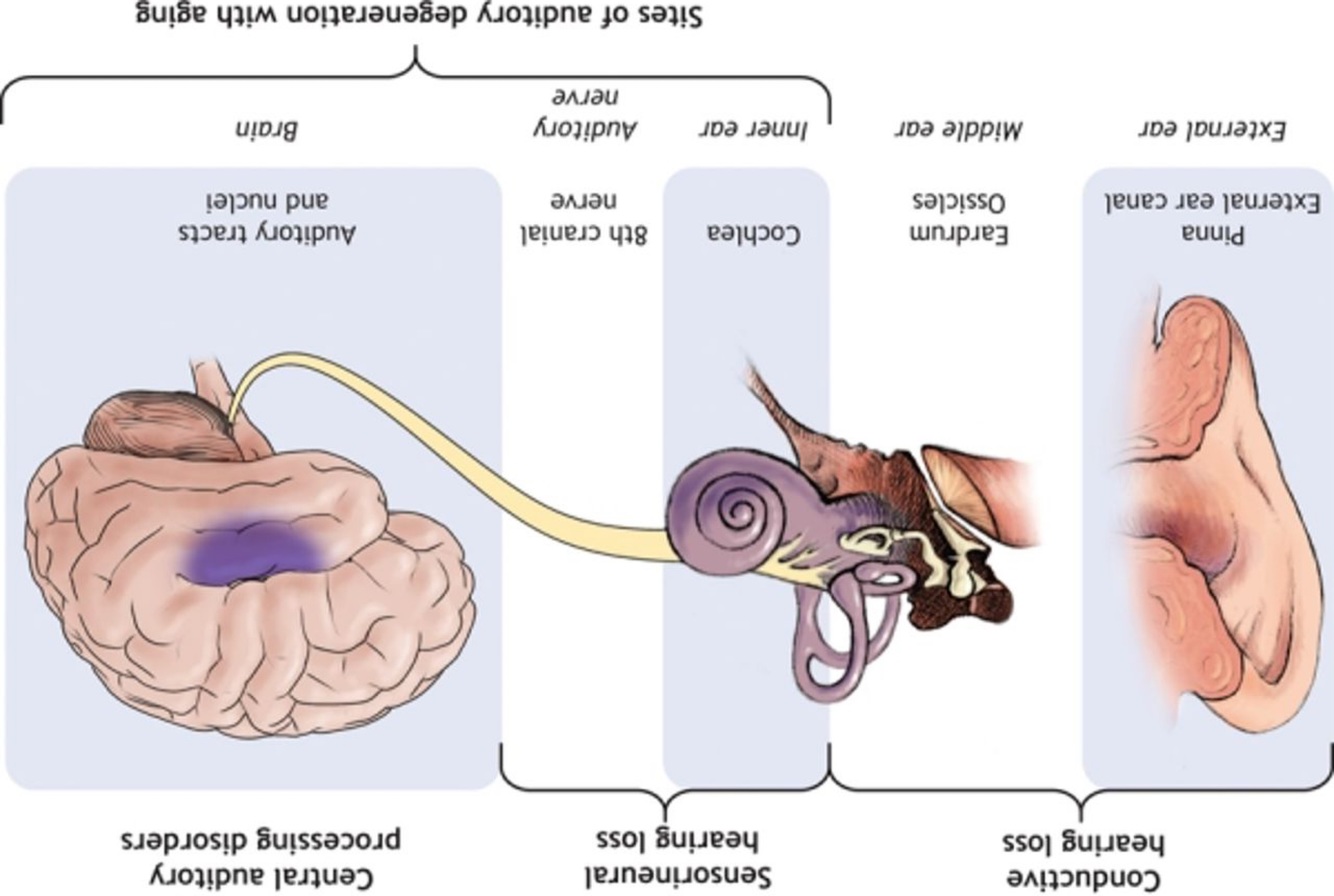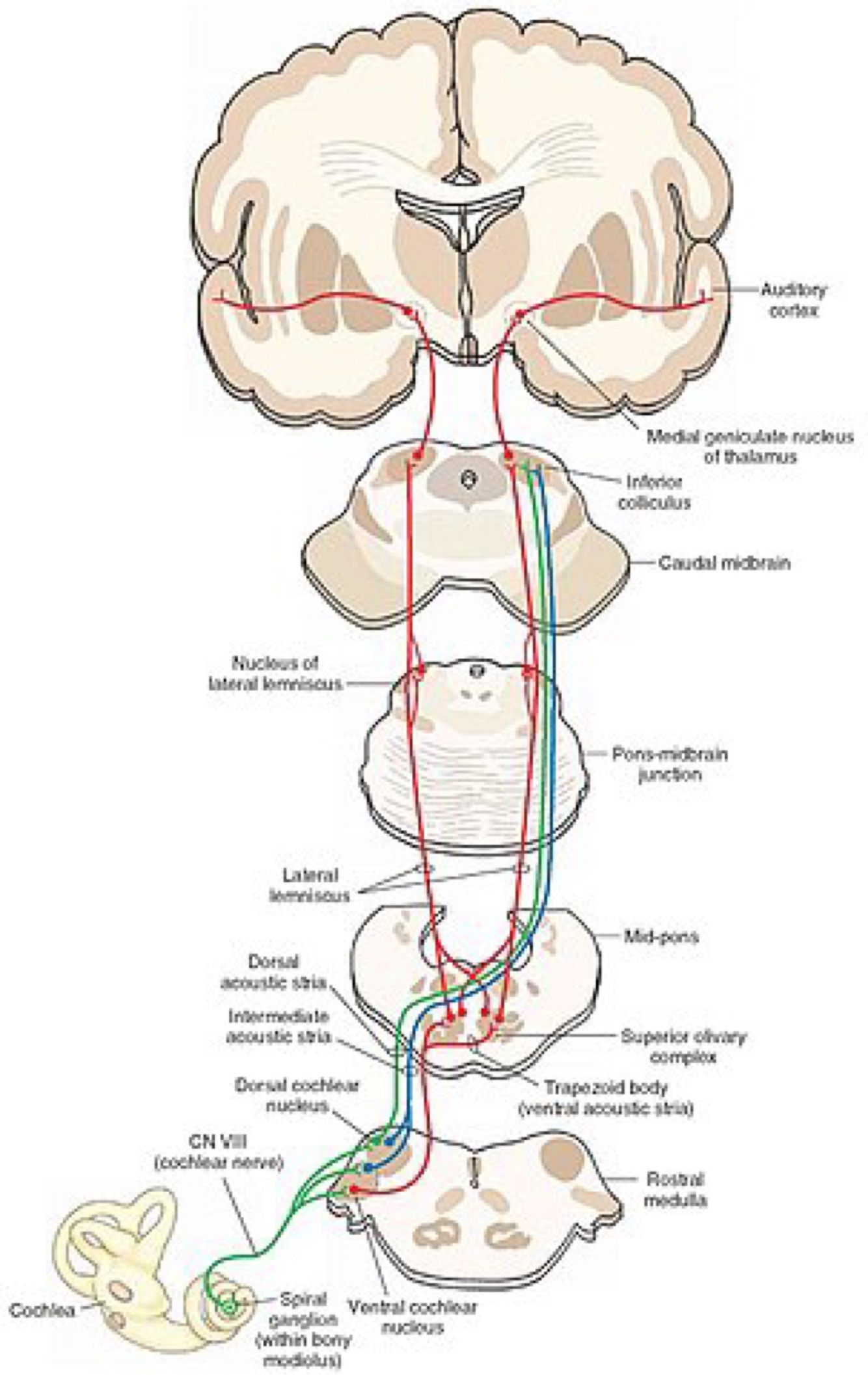 Inner/Outer hair cells -> cochlea -> cochlear nerve -> cochlear nuclei -> superior of ovary complex -> lateral lemniscus -> inferior colliculus -> auditory cortex