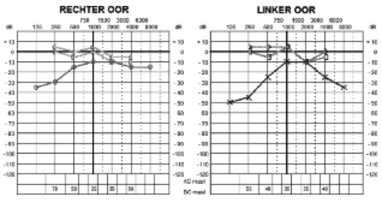 Also: Conductive HL w/larger low-frequency air-bone gaps and supranormal bone conduction