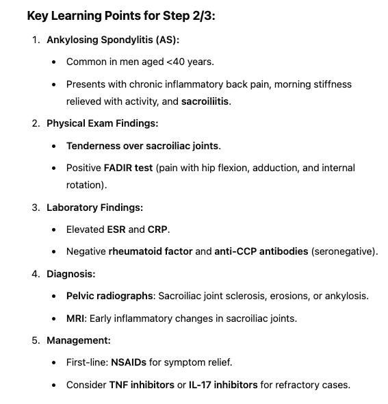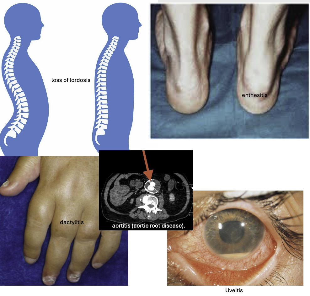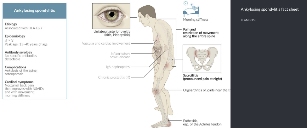 Ankylosing spondylitis is a chronic inflammatory arthritis of the spine that typically presents in young adult males. It is associated with HLA-B27 and characterized by bilateral sacroiliitis, impaired spinal mobility, loss of lumbar lordosis, and restricted chest wall expansion.