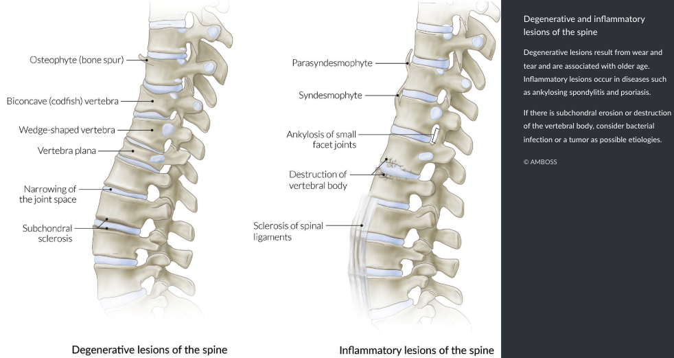 Ankylosing spondylitis is a clinical diagnosis based on symptoms of inflammatory back pain, loss of spinal mobility, and sacroiliitis. Confirmation is made using X-ray or MRI of the sacroiliac joints and spine to identify erosions, ankylosis, sclerosis, or bamboo spine.