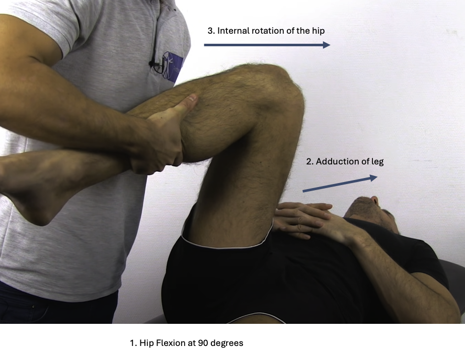 With the patient laying supine, flex the hip, adduct the leg, then internally flex the hip.