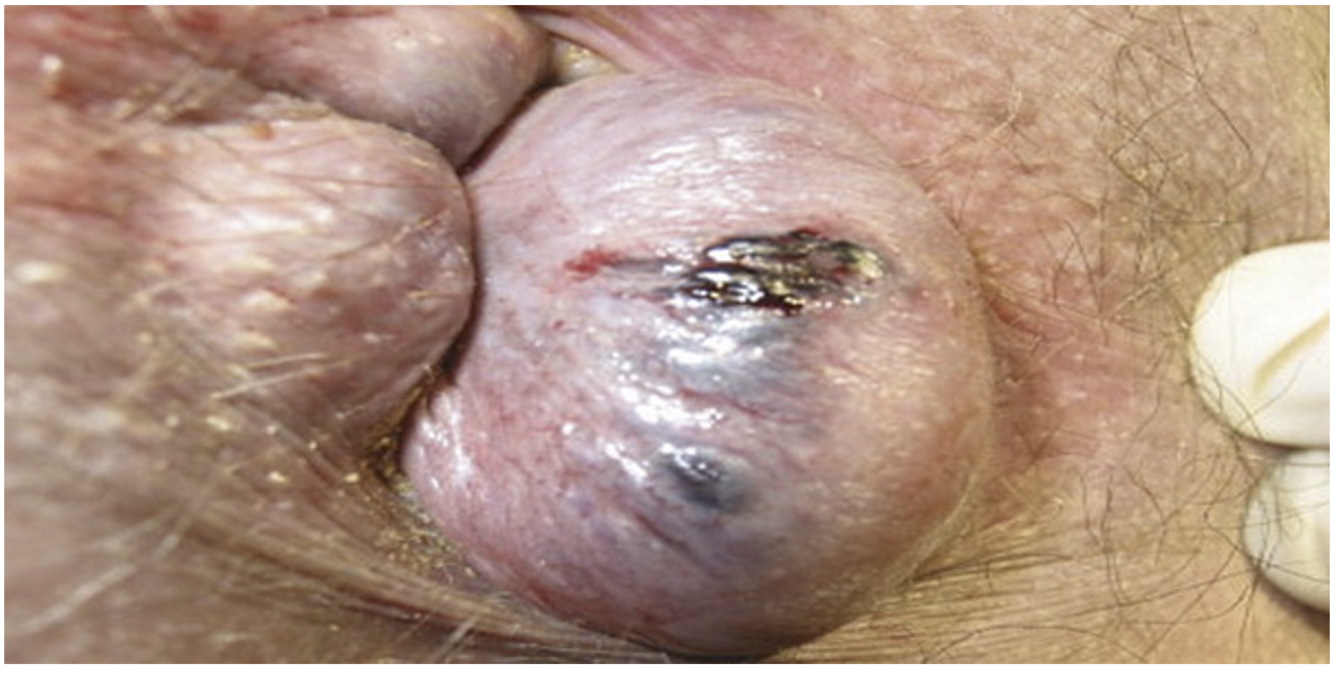 E.g. Thrombosed external haemorrhoid → very painful, tense swelling or Acute prolapse of internal haemorrhoids