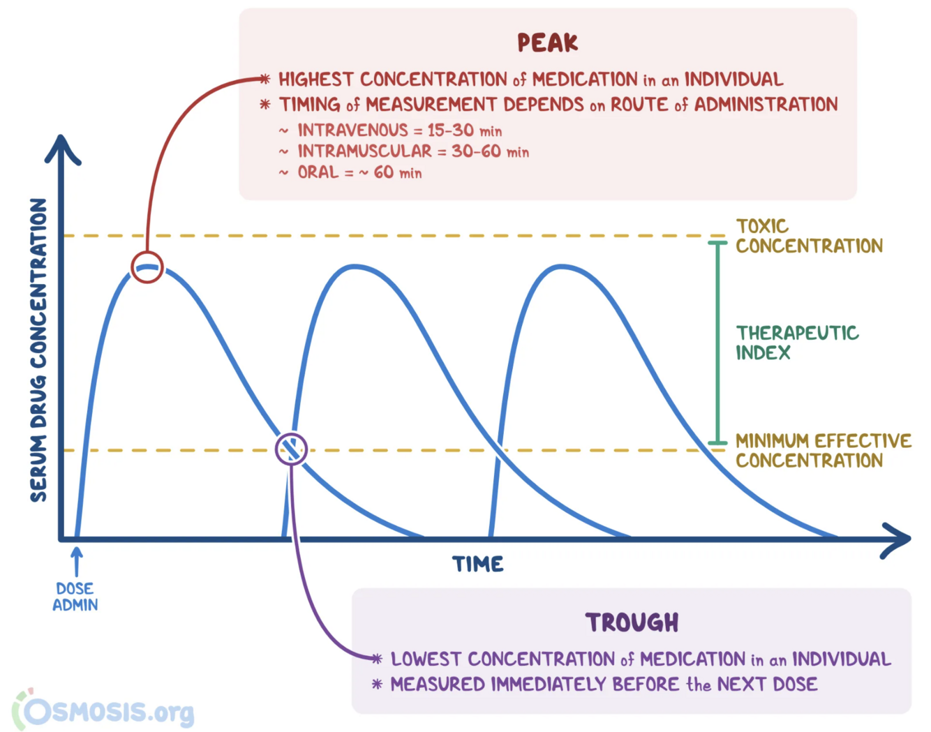 2 - when level of drug in circulation is at its lowest level in therapeutic window