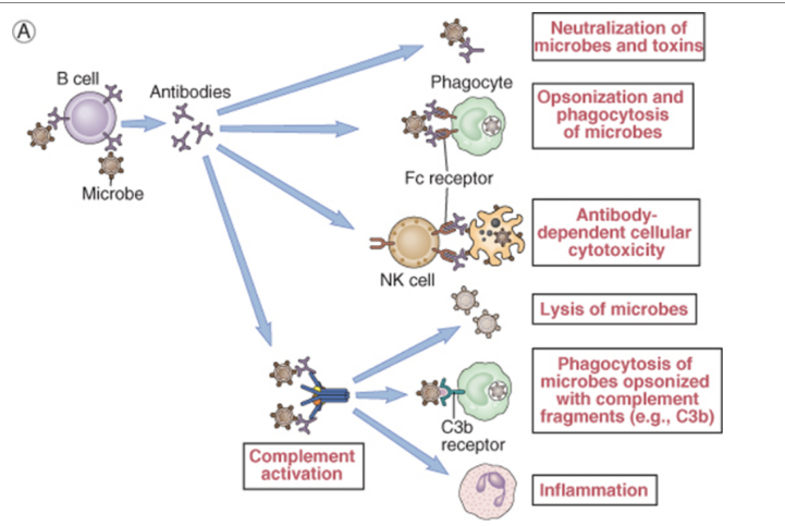 Ab bind microorganisms via the Fab and to cells by the Fc