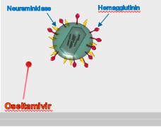 Influenza neuraminidase inhibitor e.g. Oseltamivir inhibits neuraminidase –> virus can’t be released from the host cell and is destroyed there.