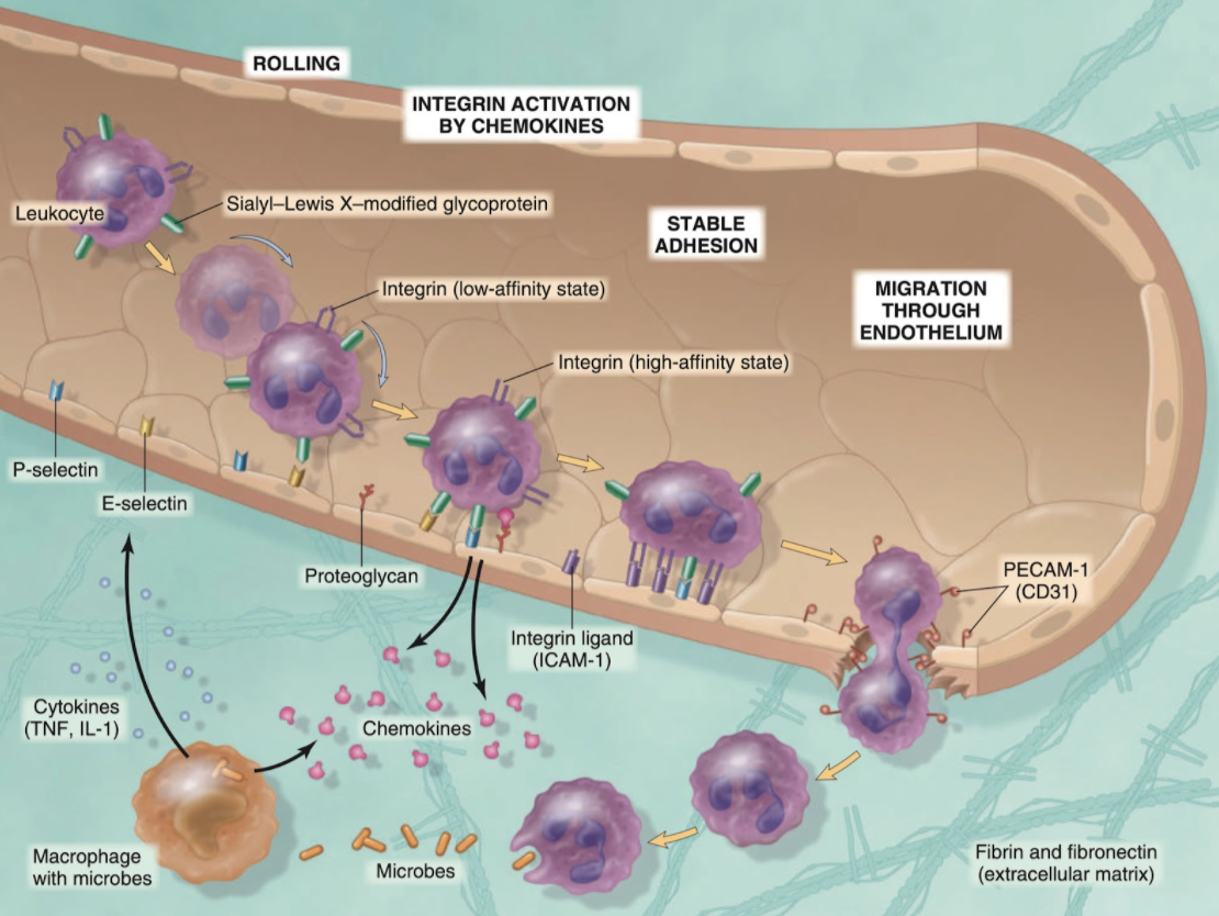 Quelles sont les 4 grandes étapes de recrutement des leucocytes au site de l’inflammation? (inflammation aiguë)