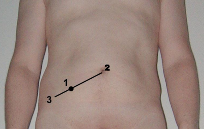 McBurney’s punkt. Laterala tredjedelen på linjen navel-crista iliaca anterior superior.