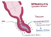 o ”Gastric upset” – långsam peristaltik >uppblåsthet > illamående > kräkning –> buksmärta - initalt diffus lokalisation, senare lokaliseras till platsen för appendix (höger fossa iliaca) när inflammationen blir transmural – smärtvandring