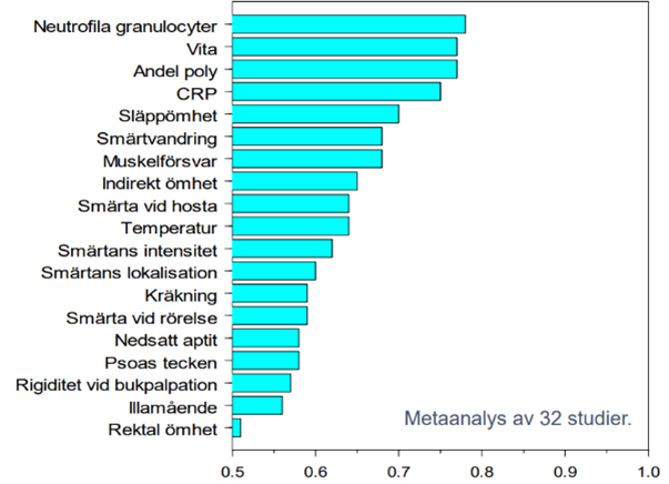 o Identifierar grupper med låg (< 4), intermediär och hög sannolikhet (>8) för appendicit (op)