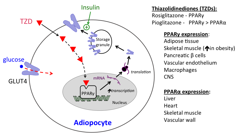 The receptors that TZDs activate are ubiquitous and are abundant in the cells within the renal collecting tubules. Hence, TZDs increase sodium reabsorption, leading to increased water retention. Compared to placebo, all TZDs are associated with a statistically significant increase in edema and weight.
