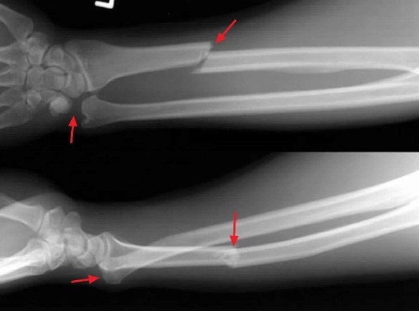 Dislocation of radio-ulnar joint Fracture of radius Can get radial nerve injury or extensor tendon injury