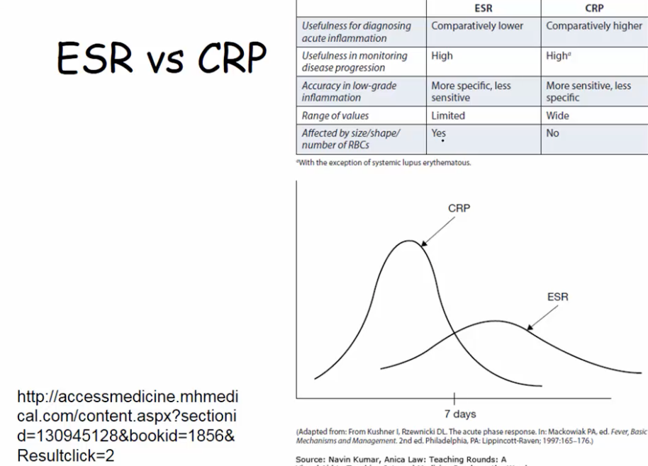 CRP is useful for acute inflammation, it goes up faster and goes down faster with the different stages of the disease. ESR can be associated with chronic inflammation