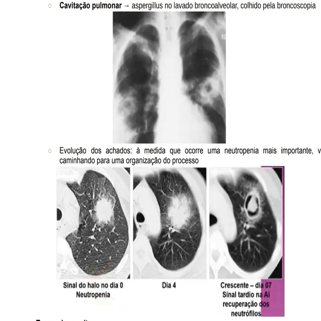 TC ou Rx mostram infiltrados pulmonares com presença de múltiplos nódulos pulmonares -> nódulos com halo em sua periferia (sinal do halo) -> evolução com extensas áreas de necrose do parênquima pulmonar