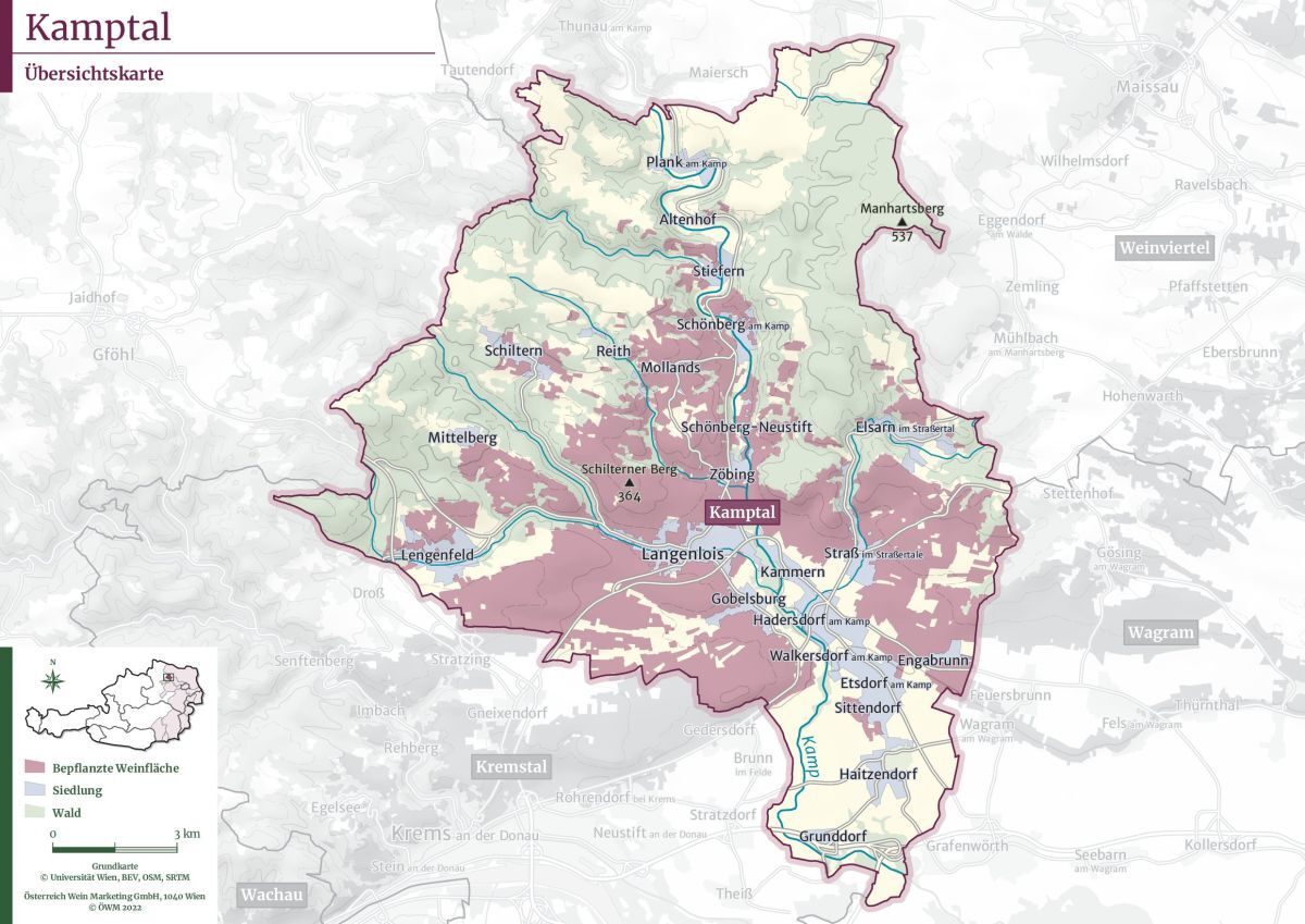 Villages: Langenlois, Zöbing, Kammern, Gobelsburg, Strass im Strassertal, Haindorf, Lengenfeld, Schönberg