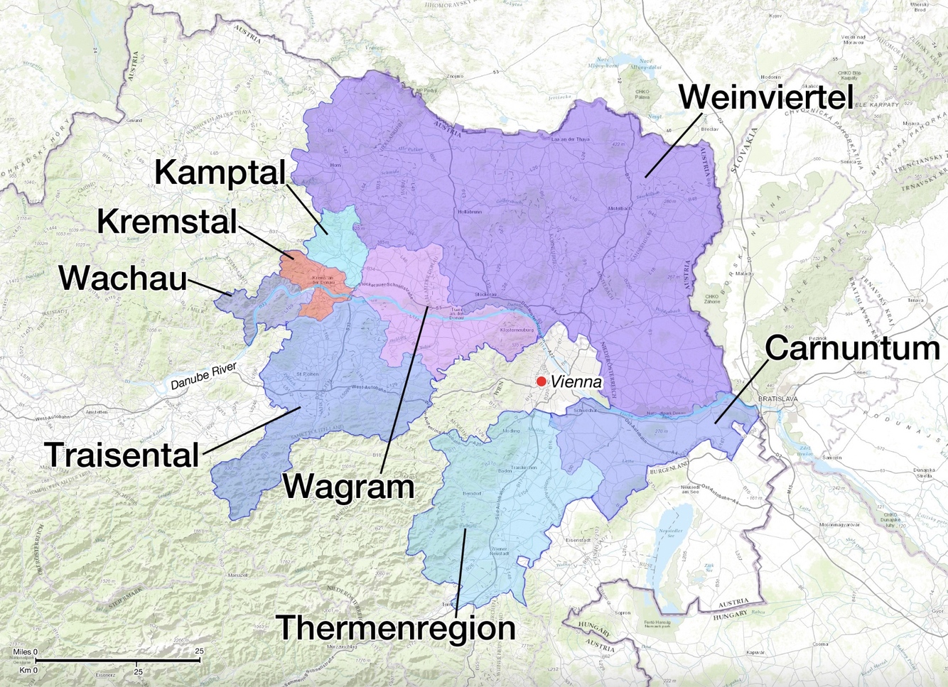 Wachau, Kremstal, Kamptal, Traisental, and Wagram: west of Vienna along the Danube, greatly influenced by the river as well as the cool winds from the northern forests and the warm Pannonian Plain to the east.
