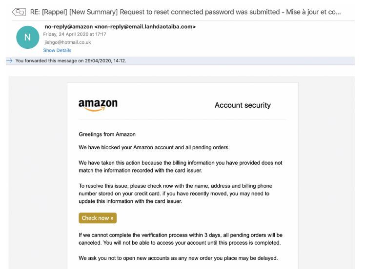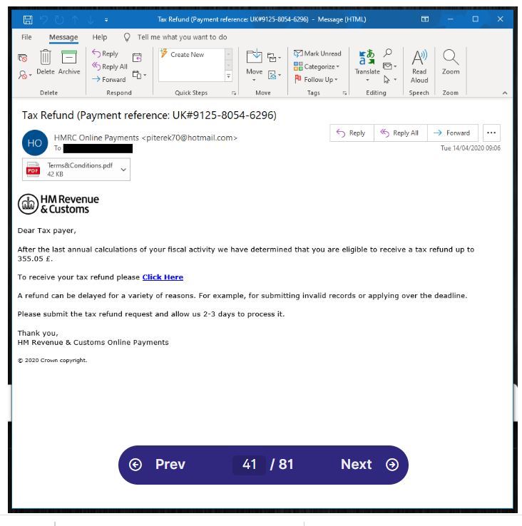 In this second example we’re going to submit an email that has a potentially malicious attachment, so we can show you how to retrieve file-based artifacts using PhishTool. Below is a screenshot of the phishing email we’re going to analyze.