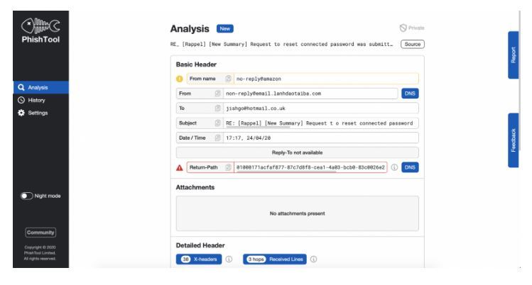 Once the analysis has been completed, you will see a screen that looks similar to the following screenshot. This page holds all of the results from artifact extraction and analysis procedures. Whilst there is a ton of useful information we can retrieve and fun things we can do, for the scope of this lesson, we are only interested in retrieving artifacts from the email (don’t worry, you’ll be using PhishTool later for analysis tasks!). You can click the clipboard icon next to artifact names to copy them.