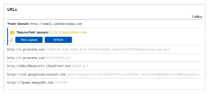 And finally down at the bottom, we have a section for URLs, where we can retrieve all hyperlinks that were included in the email.