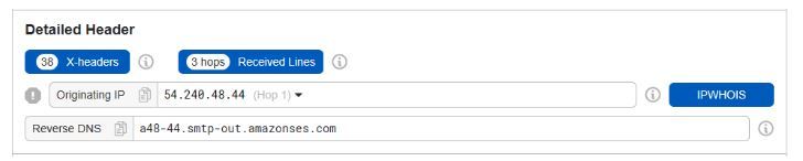 Below this, there is a section for Detailed Header that includes the X-Originating-IP and the reverse DNS results, which gives us artifacts 5 and 6.