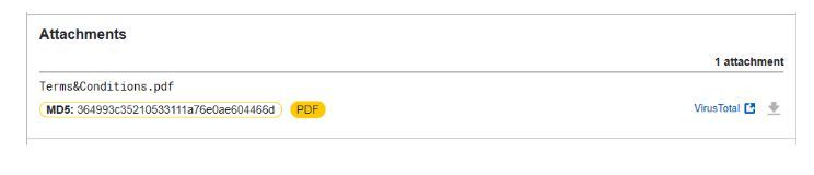 After submitting the email to PhishTool, under the Basic Header section there is a section titled Attachments. This provides us with the MD5 hash of the file and the file name! We can also click on the VirusTotal link to automatically submit the hash for analysis and retrieve a community reputation score.
