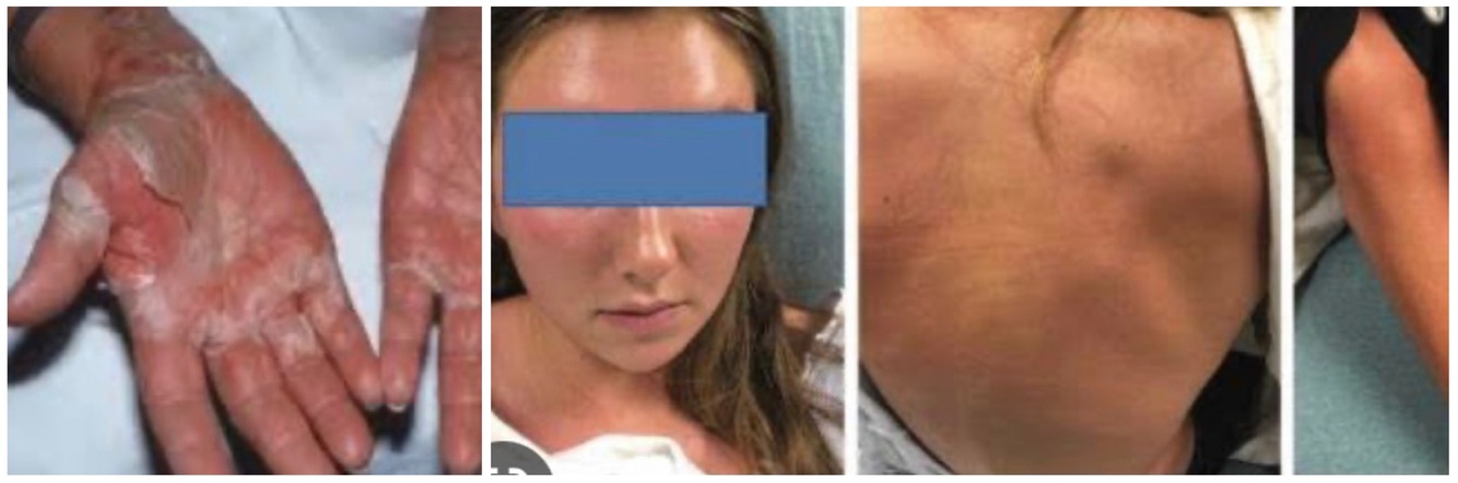 –> after days, desquamating rash.