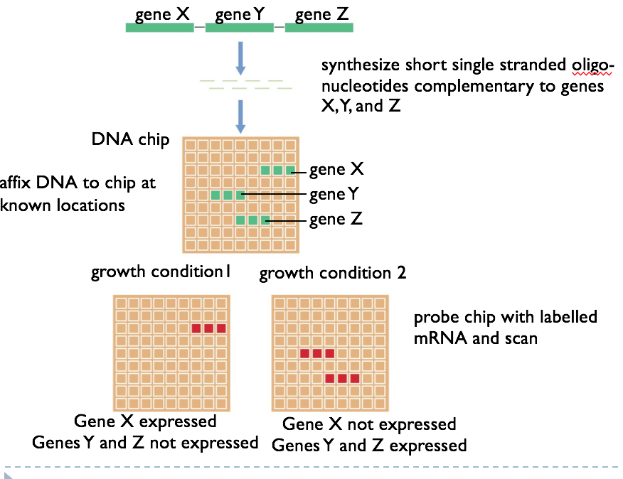}Probing of chip with fluorescently labelled mRNA can be used to investigate expression levels of all genes simultaneously.