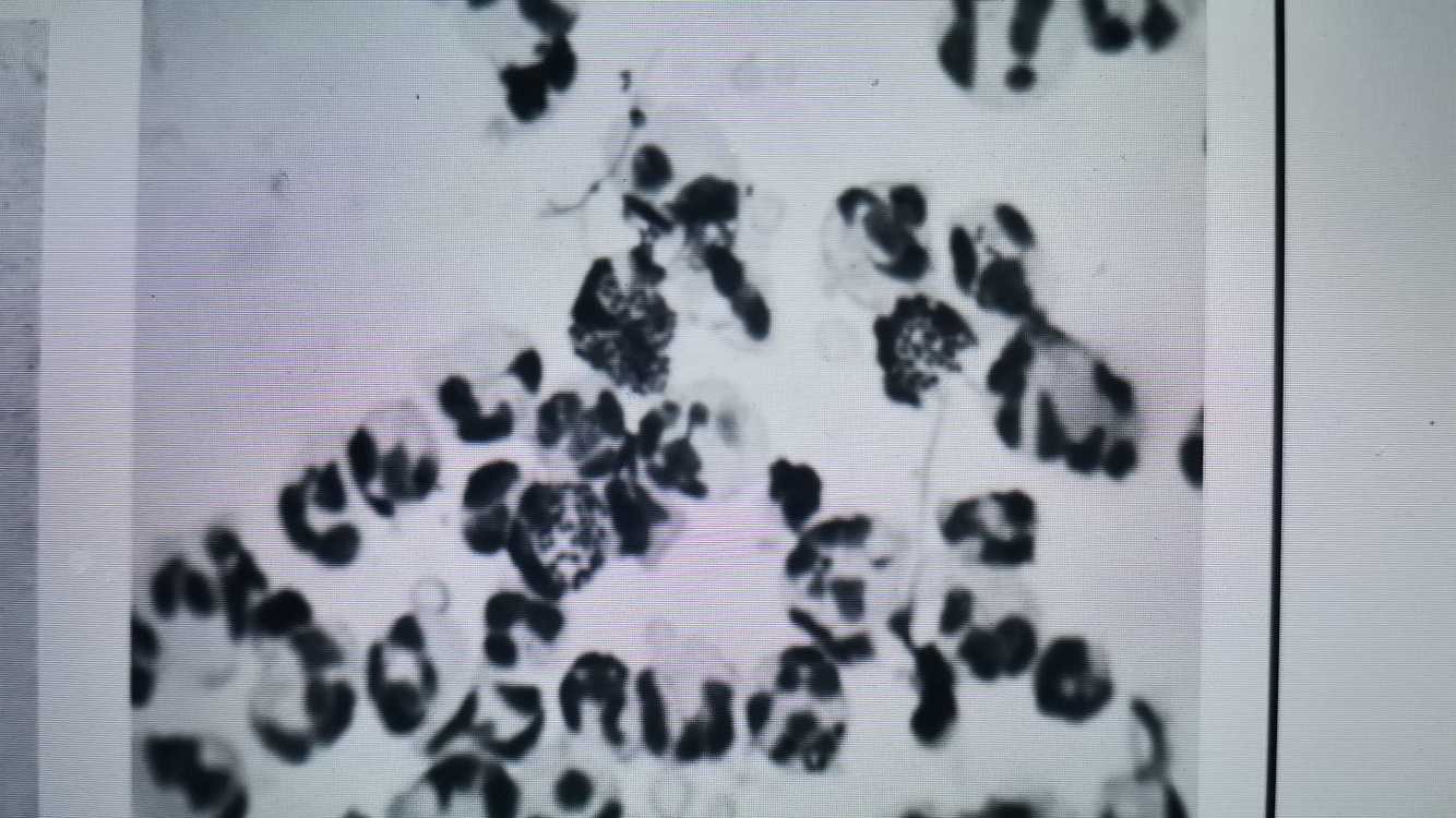 Abklatschpraeparat einer Pustel des 2 J. Dackels, zahlreiche neutrophile Granulozyten (durch segmentierte Kerne gekennzeichnet), in 3-4 dieser Neutros zahlreiche, kleine, runde (original dunkelblaue) Strukturen im Zytoplasma = intrazellulaere Bakterien, diese bestaetigen Diagnose einer bakteriellen Infektion