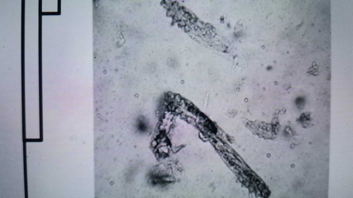 Ergebnis eines tiefen Hautgeschabsels, verwendet um Demodexmilben zu diagnostizieren, hier klassische Demodex canis Milben = Diagnose: Demodikose