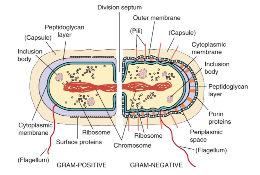 Beskriv forskellen på Gram-positiv og Gram-negative bakteriers cellestruktur