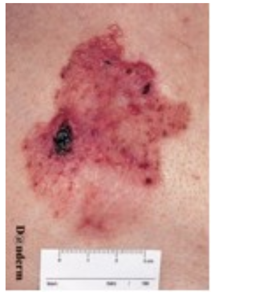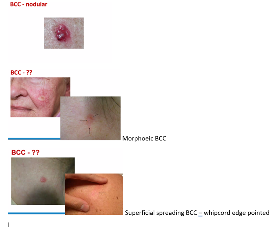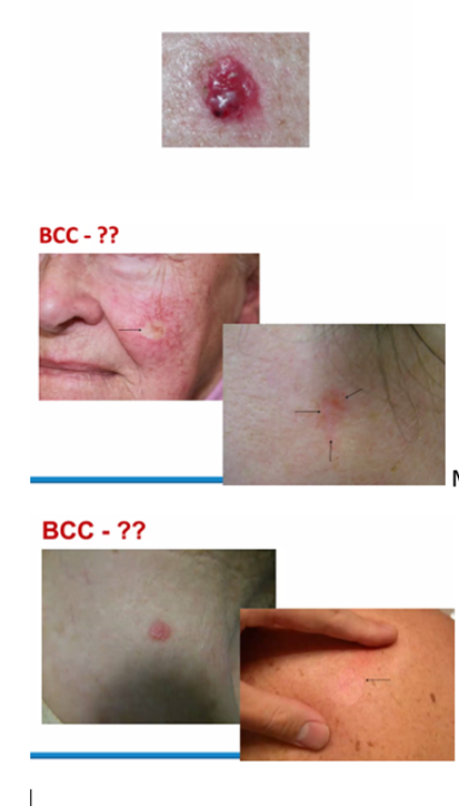 This type of BCC presents as a red scaly plaque. A rolled edge/ pearly border is sometimes discernible.