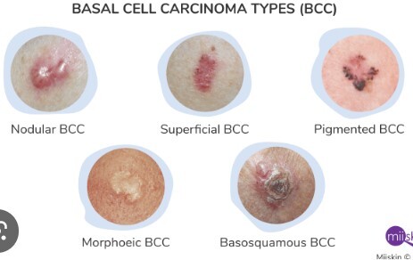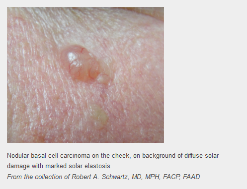 Commonest form of skin malignancy, related to sun exposure.