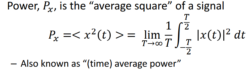 The average square of a signal: ( P_x = ∫ x(t)^2 dt )