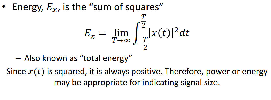 Energy signals have ( 0 < E_x < ∞ ) and ( P_x = 0 ).