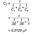 Explanation: When a 0.02-microfarad, a 0.05-microfarad, and a 0.10-microfarad capacitor are connected in series, the total capacitance is 0.0125 microfarad