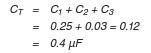 1. (Refer to Figure 2.) What is the total capacitance of a certain circuit containing three capacitors with capacitances of .02 microfarad, .05 microfarad, and .10 microfarad, respectively?