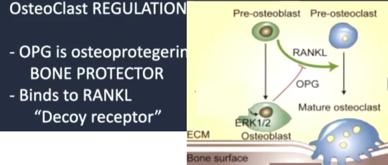 Osteoprotegerin (OPG): prevents osteoclast activation by inactivating RANKL (osteoprotegrin Protects)