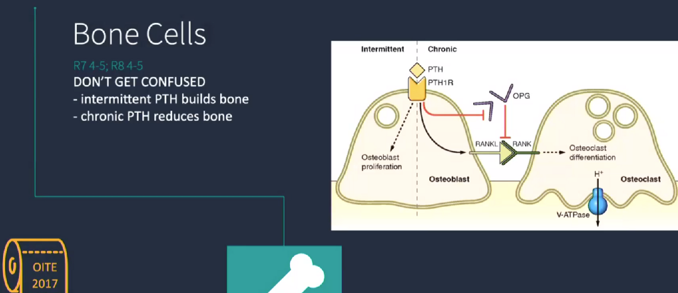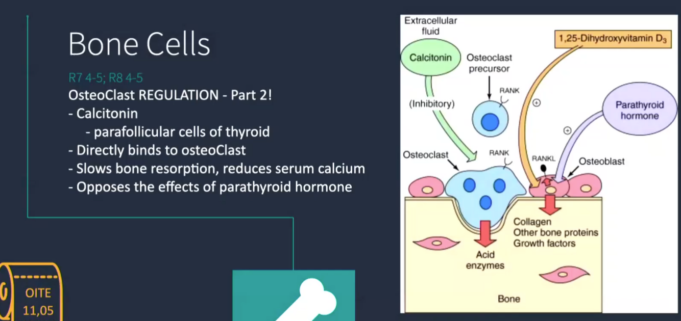Calcitonin: released from parafollicular cells of the thyroid, binds to and inhibits osteoclasts, slowing bone resorption and reduces serum calcium.