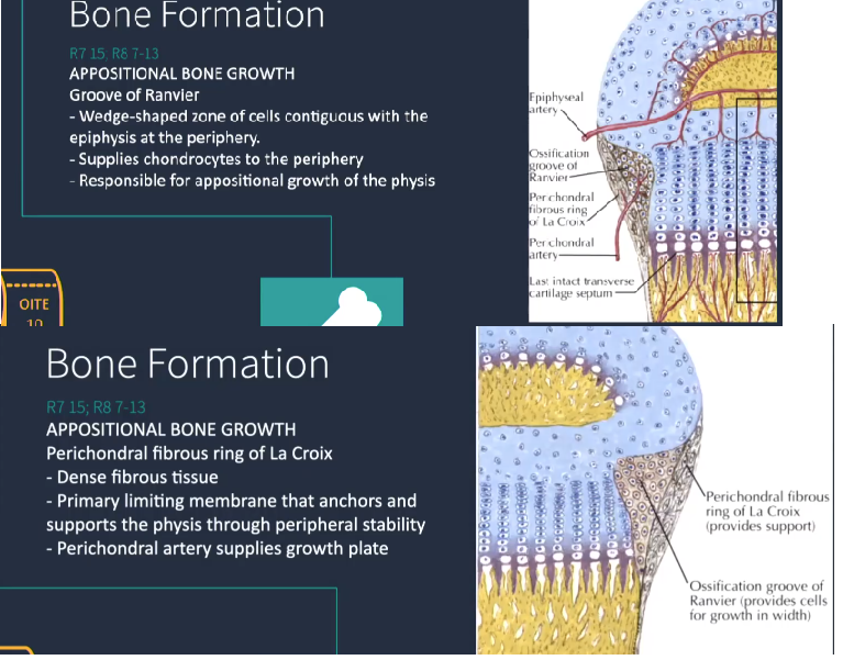 appositional formation, osteoblasts lay down new bone on existing bone; the groove of Ranvier supplies the chondrocytes. Periosteal bone enlargment (width)