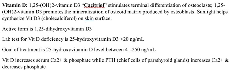 Calcium: 99% in bone, hydroxyapatite, absorption in GI, resorption in Kidneys, Bone. Intake= adults 750 mg/day for adults; postmenopausal/fractures = 1500 mg/day for adults
