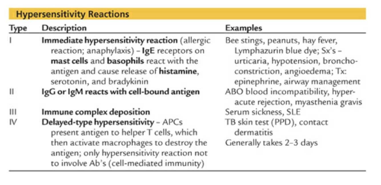 What are the 4 hypersensitivity reactions?