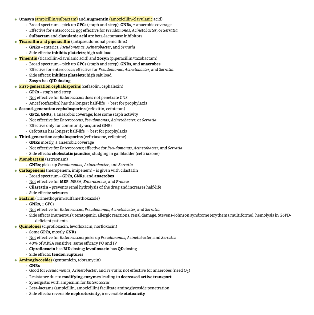 how about penicillin, nafcillin, oxacillin, ampicillin/amoxicillin, unasy/augmentin, ticarcillin/piperacillin/timentin/cephalosporins/ monobactam/carbapenem/bactrim/quinolones/aminoglycosides?