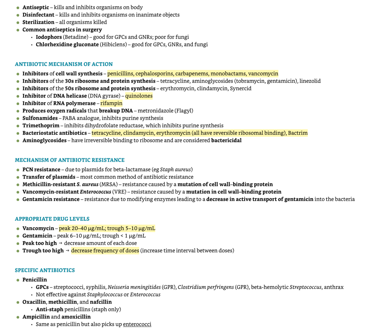 What are the antibiotic mechanism of action, mechanism of antibiotic resistance, appropriate drug levels,