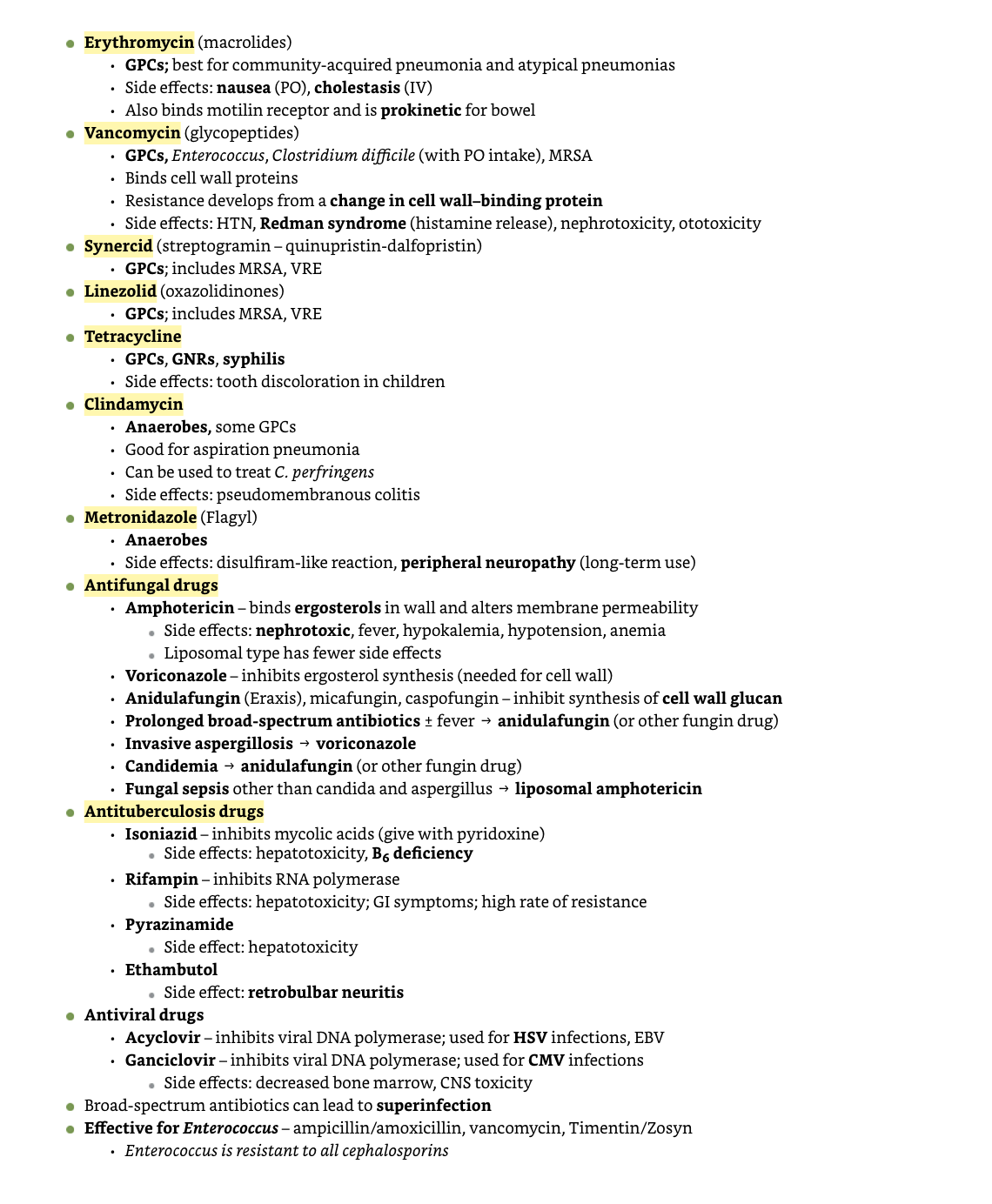 How about Erythromycin, Vancomycin, Synercid, Linezolid, Tetracycline, Clindamycin, Metronidazole, Antifungal drugs, anti tuberculosis drugs