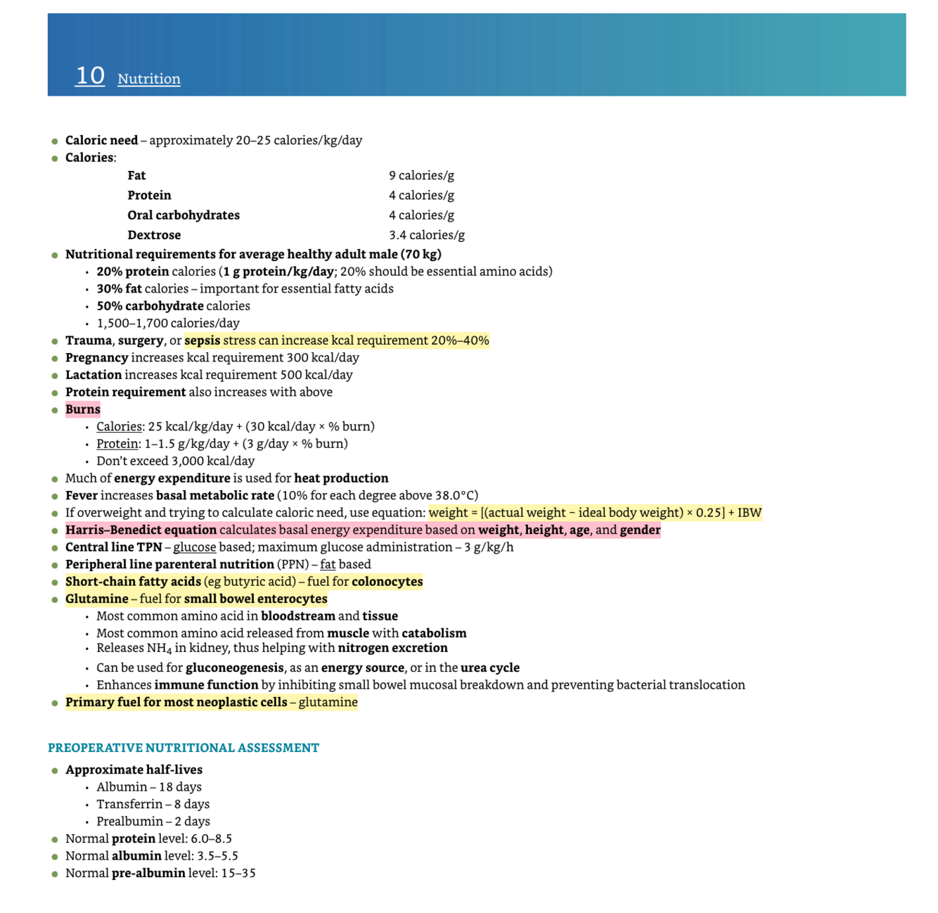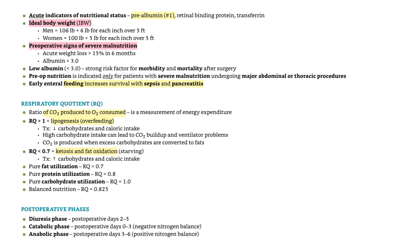 Nutritional requirements? What is the Harris Benedikt equation? Perioperative nutrional assessement? Respiratory quotient? Postoperative phases?