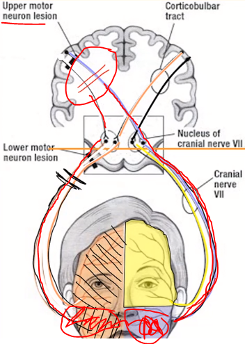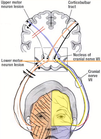 unilateral facial weakness of both upper and lower parts of the face are characteristic central nervous system process (stroke) will spare the upper facial muscles (so still can raise forehead)