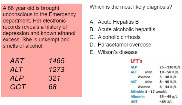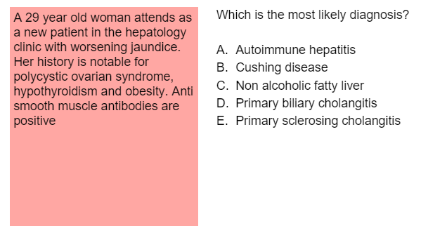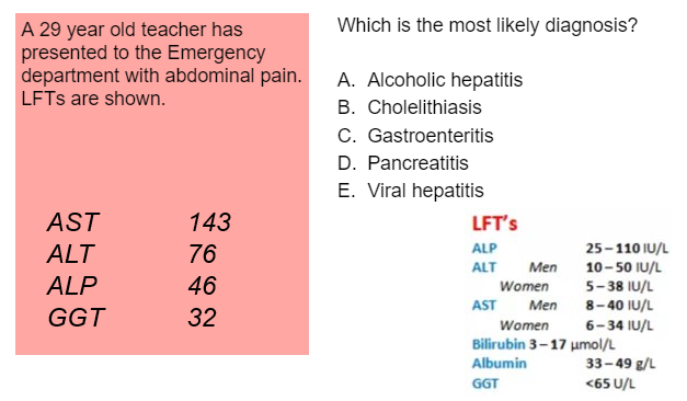 A person presents with nausea vomitting diarrhoea, fever, jaundice and abdominal pain. His ALP, AST, ALT are all super high. Furthermore he has has done the following