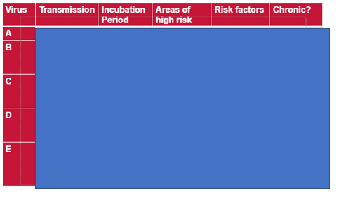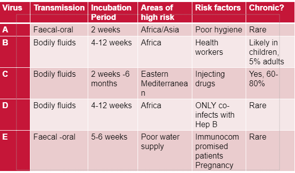 Hep A: faecal oral route- shellfish (purify water, if faeces in there you ingest them), oral anal sex (eating faeces), unwashed vegetables (if used contaminated water) COMMON In ASIA AND AFRICA (travel)